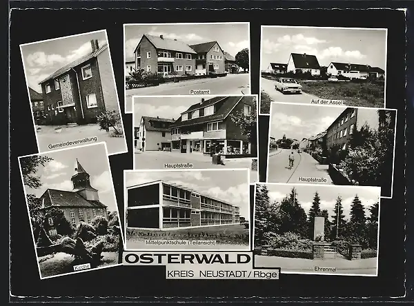 AK Neustadt a. Rbge., Hauptstrasse, Postamt, Gemeindeverwaltung, Ehrenmal