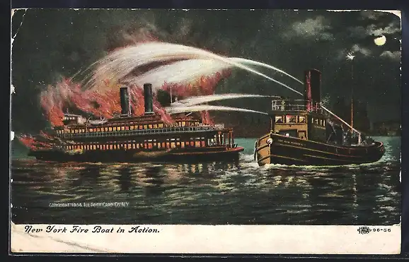 AK New York, Fire Boat in Action, Feuerwehr-Löschboot im Einsatz
