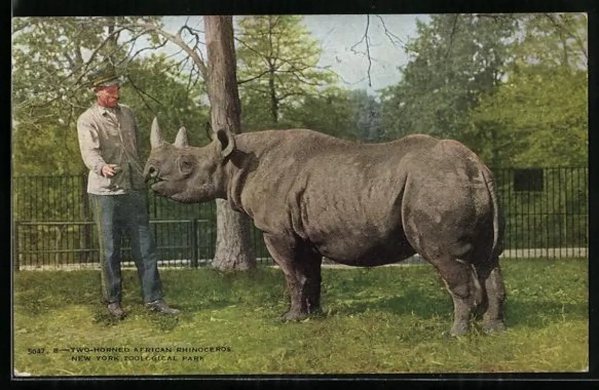 AK New York, NY, Two-horned African Rhinoceros, Nashorn mit Tierwärter