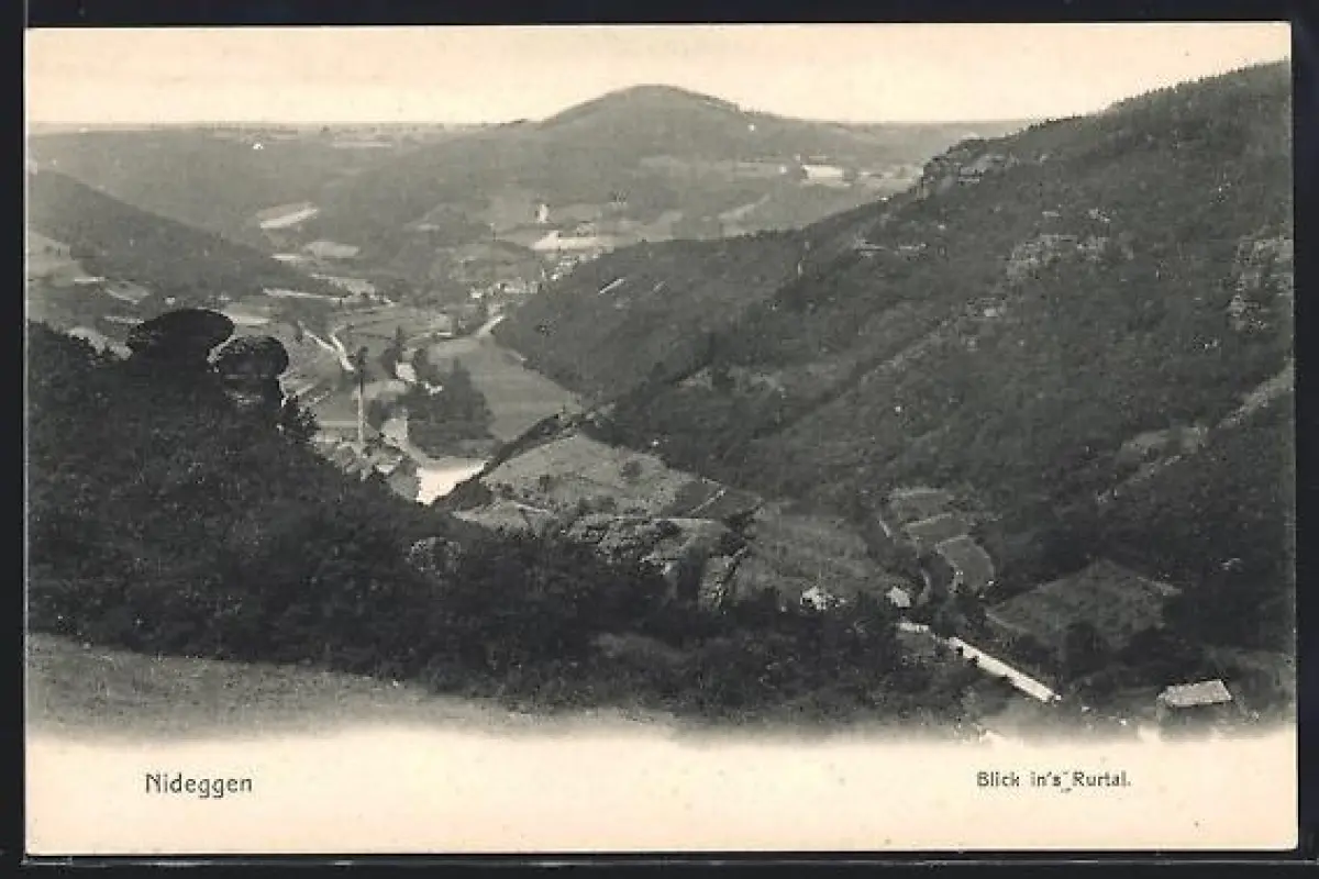 AK Nideggen, Blick ins Rurtal mit Flusspartie und Wäldern