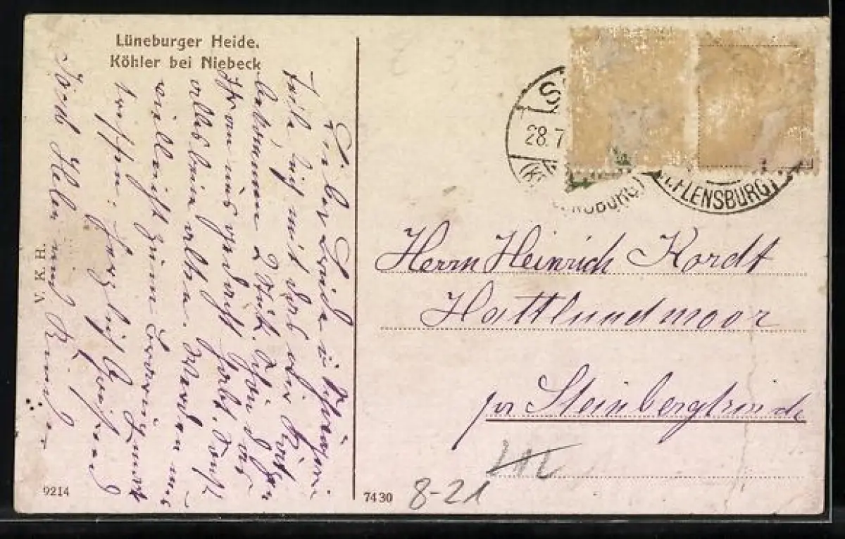 Personenbezogene Daten auf der Rückseite der Karte wurden durch blauen Textmarker unkenntlich gemacht. Die blauen Stellen sind auf die Vorderseite durchgeweicht und wirken sich negativ auf das Postkartenfoto aus
