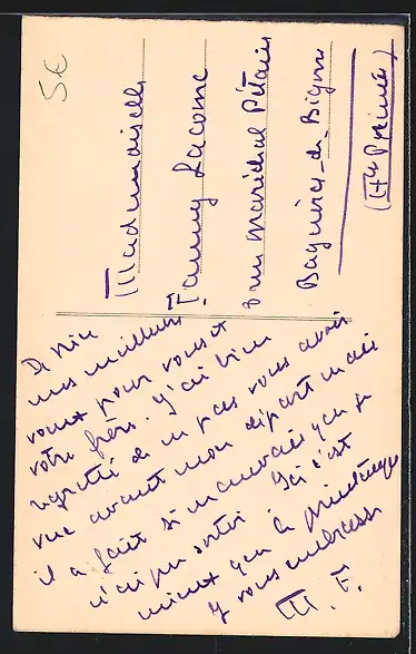 Personenbezogene Daten auf der Rückseite der Karte wurden durch blauen Textmarker unkenntlich gemacht. Die blauen Stellen sind auf die Vorderseite durchgeweicht und wirken sich negativ auf das Postkartenfoto aus