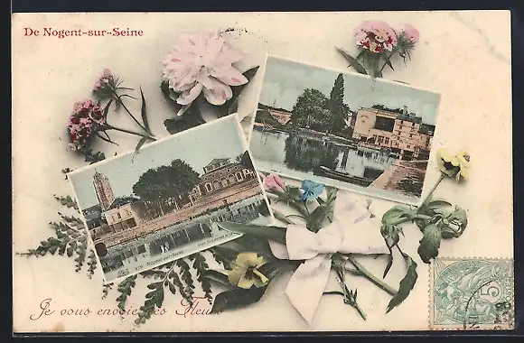 AK Nogent-sur-Seine, Vues du village avec fleurs et message Je vous envoie des fleurs