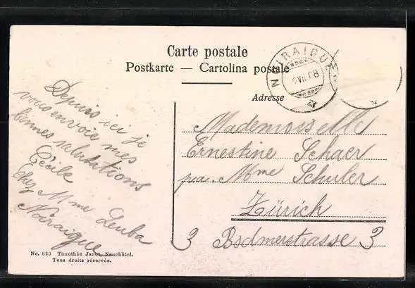 gelaufen 1908, Briefmarke entfernt, guter Zustand