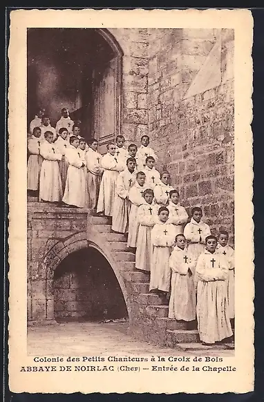 AK Noirlac, Abbaye, Entrée de la Chapelle avec les Petits Chanteurs à la Croix de Bois