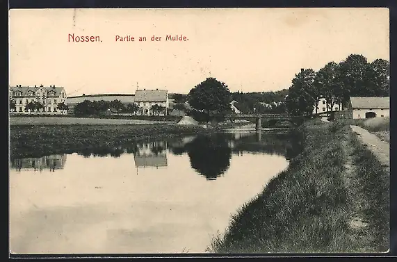 AK Nossen, Partie an der Mulde, Panorama mit Brücke