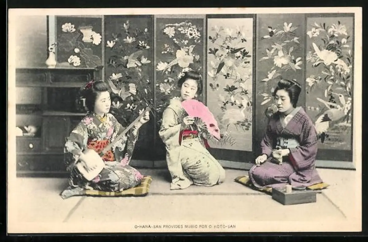 AK O-Hana-San musiziert für O-Koto-San, Japanerinnen, Geisha