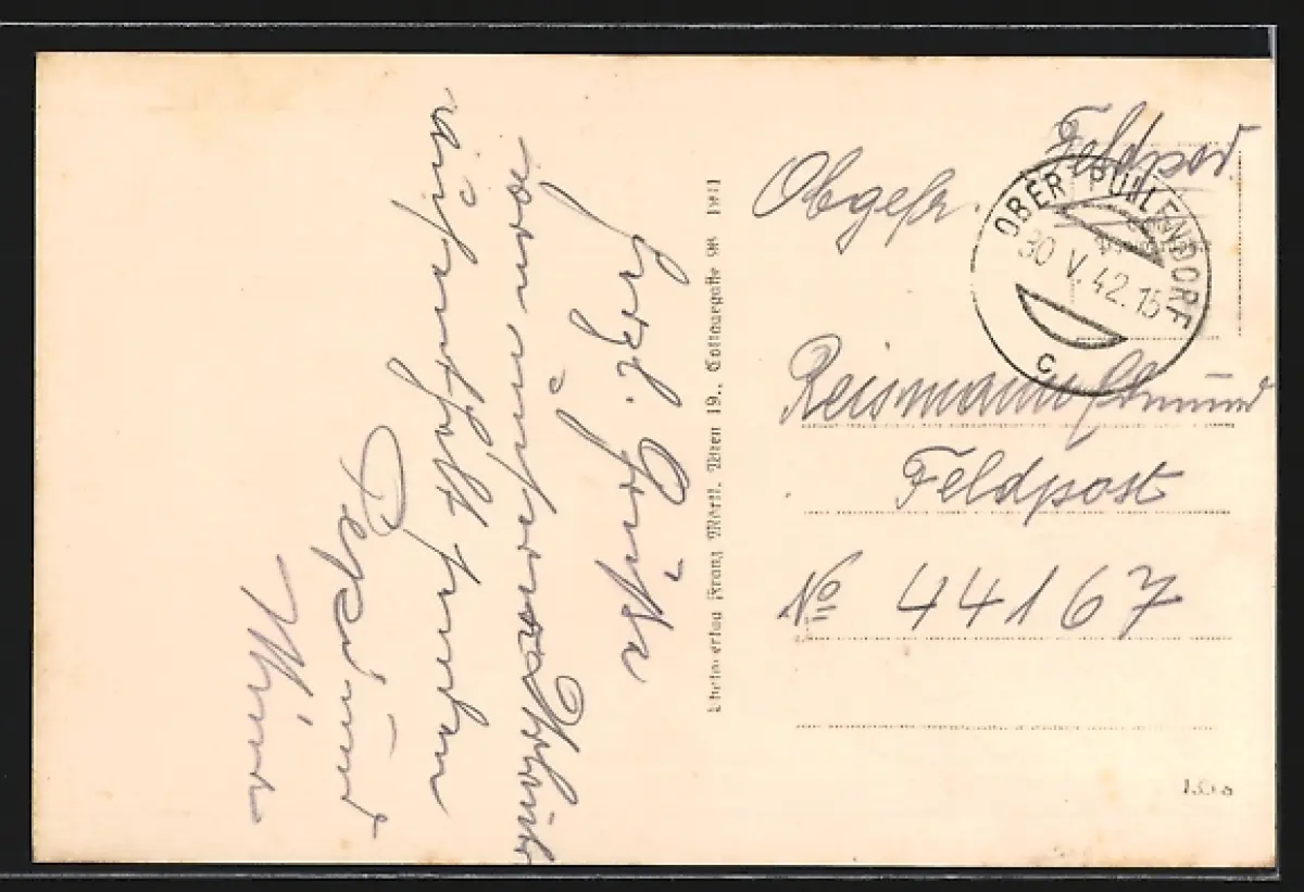 alte Ansichtskarte, gelaufen 1942 als Feldpost, Stempelspur, Eckknick links oben, sonst guter Zustand
