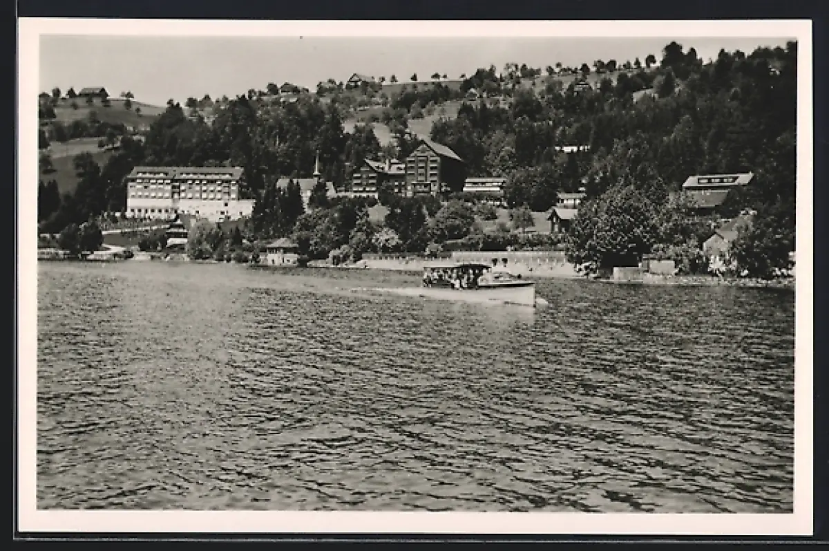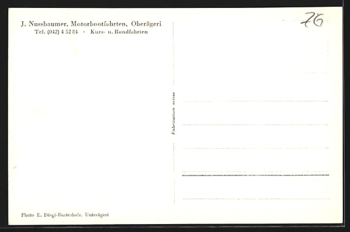 AK Oberägeri, Ortspanorama mit Motorboot, J. Nussbaumer, Motorbootfahrten