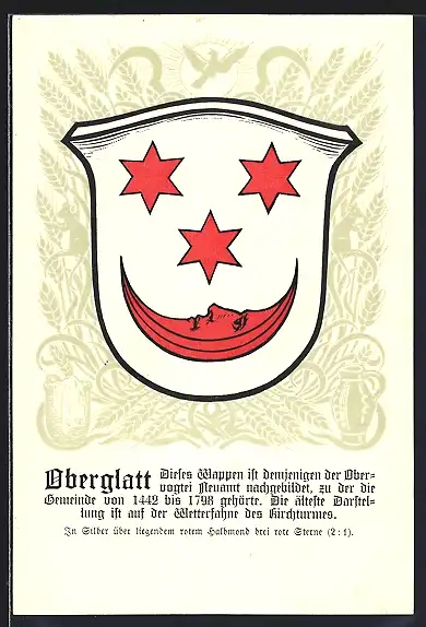 AK Oberglatt, Wappen auf Ähren-Ornamenten, Krug, Sicheln, Info-Text