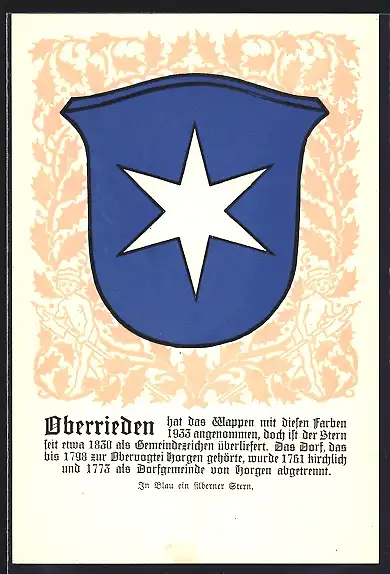 AK Oberrieden, Wappen auf Ilex-Ornamenten, Kinderfiguren, Info-Text