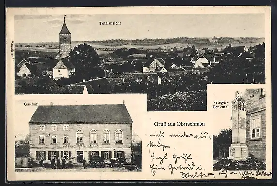 AK Oberschmon, Gasthof, Kriegerdenkmal und Totalansicht