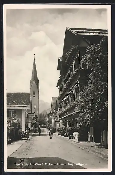 AK Oberstdorf /Bay., Strassenpartie beim Löwen, mit Kirche