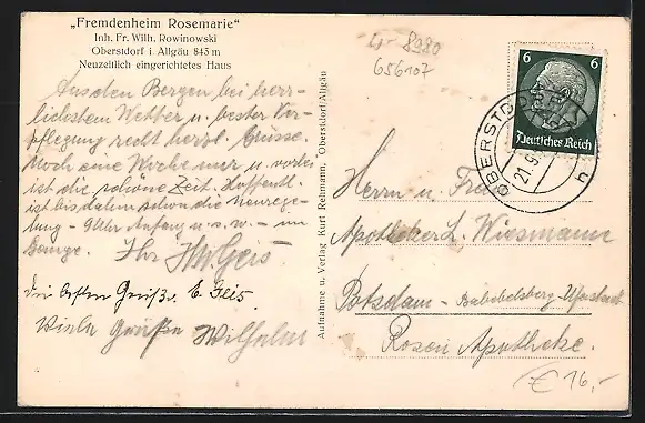 AK Oberstdorf i. Allgäu, Fremdenheim Rosemarie, Inh. Fr. Wilh. Rowinowski,