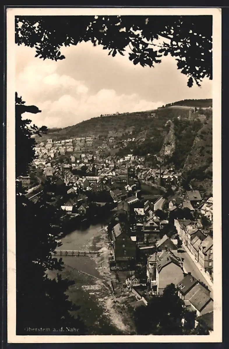 AK Oberstein a. d. Nahe, Stadtansicht mit Fluss und umliegenden Hügeln