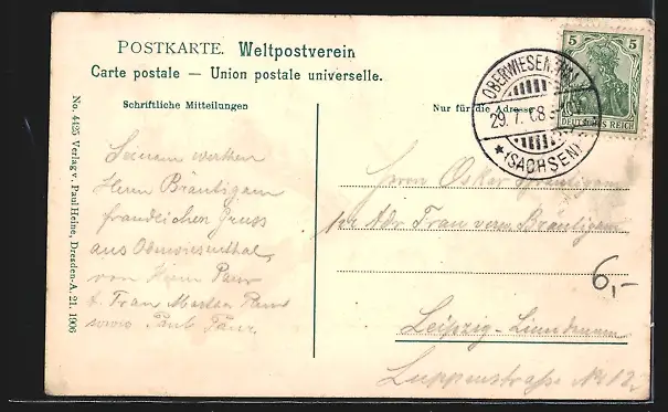 alte Ansichtskarte, gelaufen 1908, Stempelspur, guter Zustand