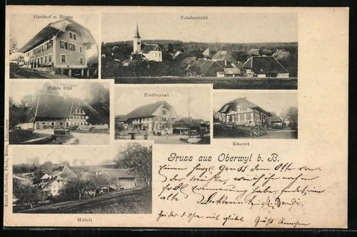 AK Oberwil b. Büren, Gasthof zum Bären, Mühle Otti, Postbureau und Käserei