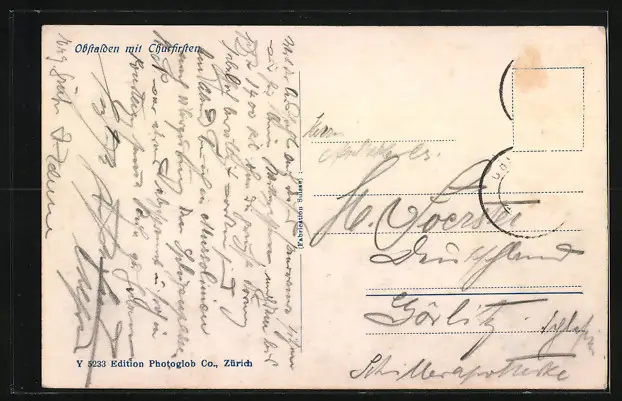 Personenbezogene Daten auf der Rückseite der Karte wurden durch blauen Textmarker unkenntlich gemacht. Die blauen Stellen sind auf die Vorderseite durchgeweicht und wirken sich negativ auf das Postkartenfoto aus