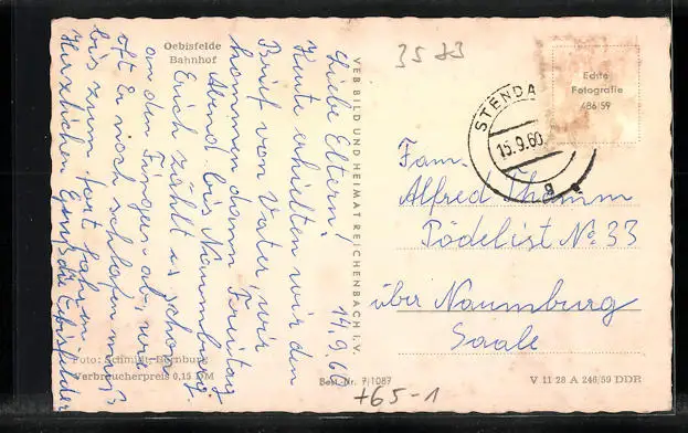 gelaufen 1960, Briefmarke entfernt, Eckknick links oben, guter Zustand