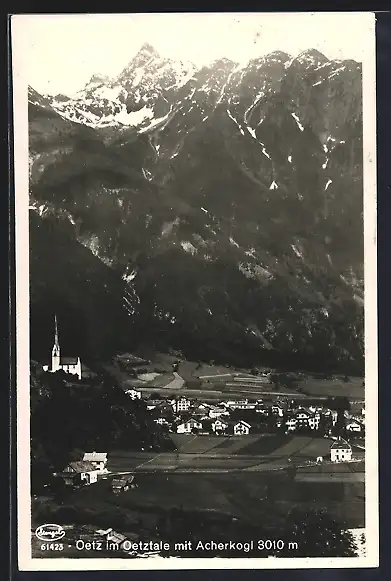 AK Oetz im Oetztal, Teilansicht mit Kirche und Acherkogl
