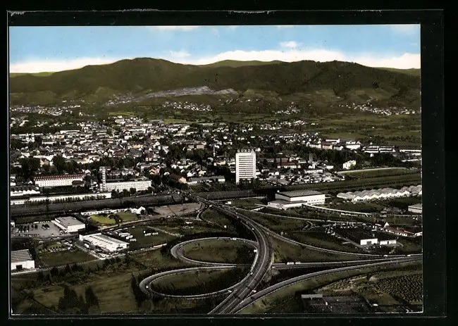 AK Offenburg /Baden, Totalansicht mit Autobahnkreuz, BURDA-Haus