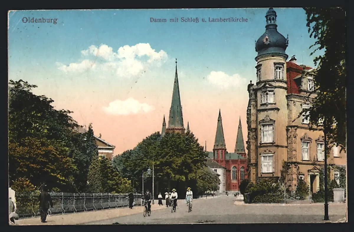 AK Oldenburg / Gr., Strassenblick auf Damm mit Schloss und Lambertikirche