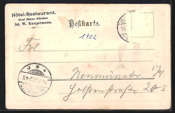 alte Ansichtskarte, gelaufen 1902, Briefmarke entfernt, rückseitig Oberflächenschaden, guter Zustand