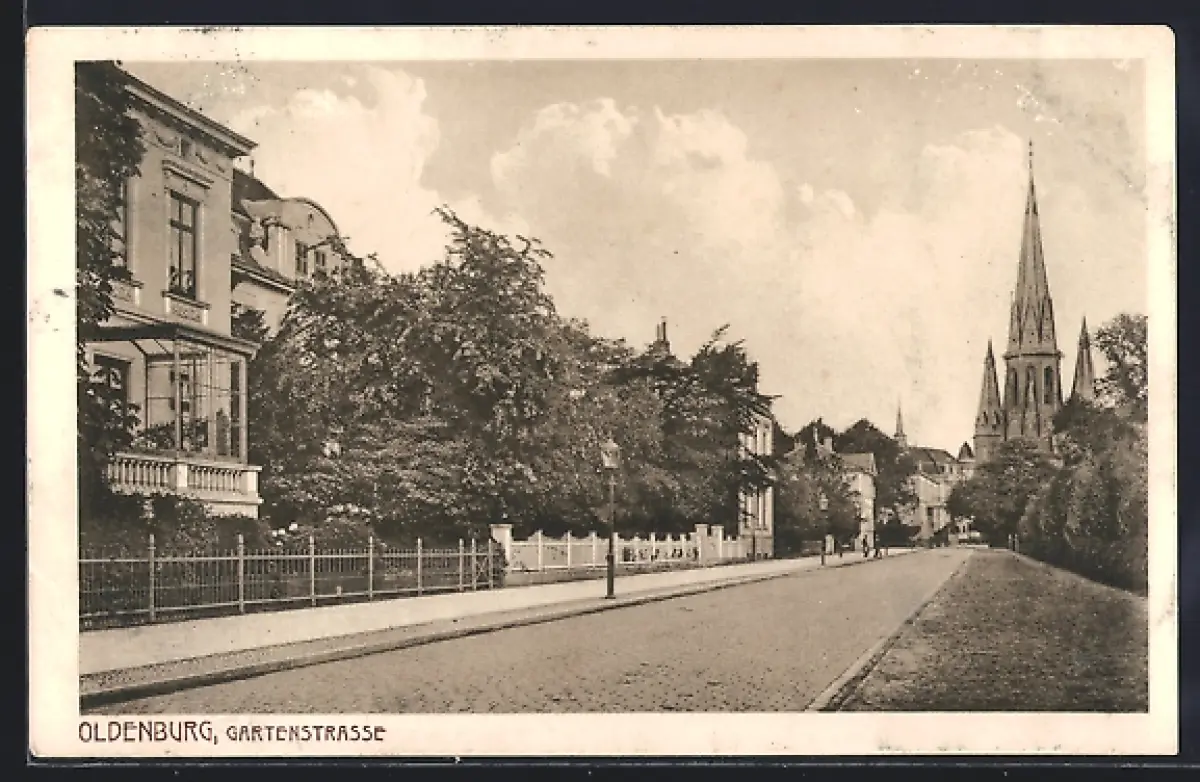 AK Oldenburg / O., Gartenstrasse, Strassenszene mit Kirche