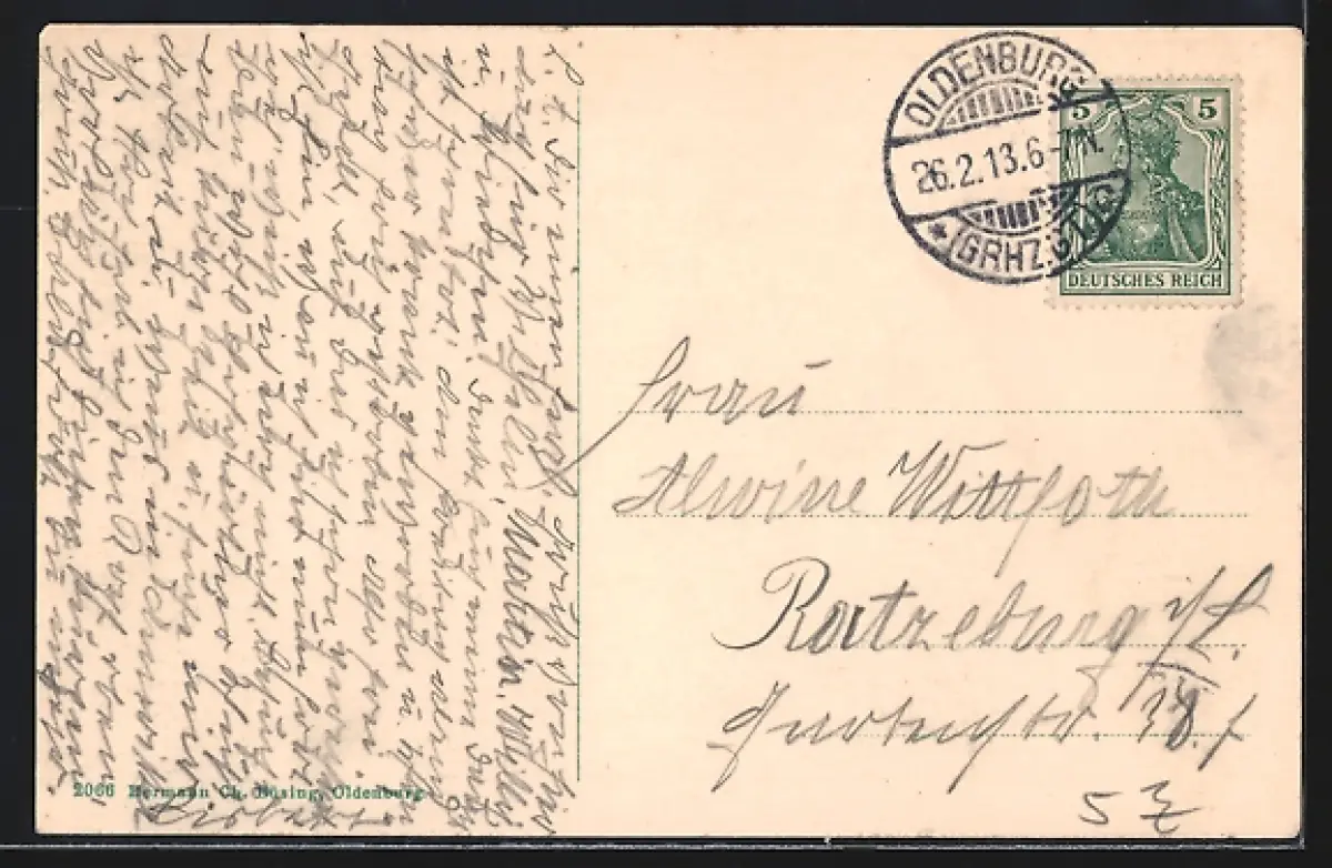 Personenbezogene Daten auf der Rückseite der Karte wurden durch blauen Textmarker unkenntlich gemacht. Die blauen Stellen sind auf die Vorderseite durchgeweicht und wirken sich negativ auf das Postkartenfoto aus