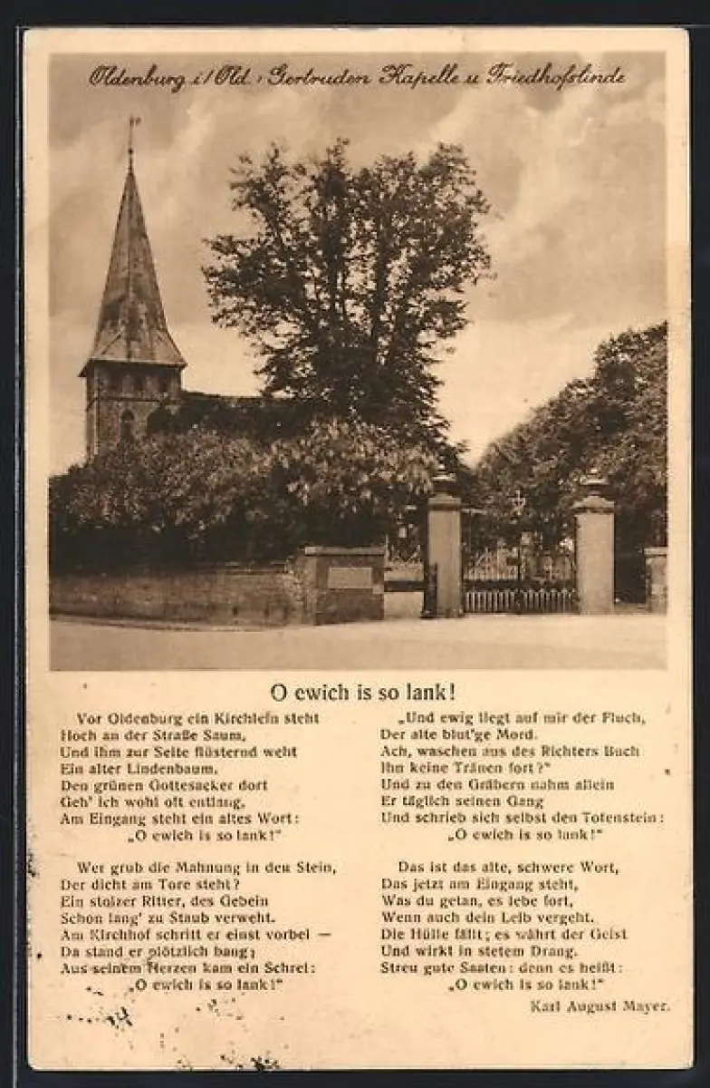 AK Oldenburg / O., Gertruden Kapelle u. Friedhofslinde, Lied O ewich is so lank!