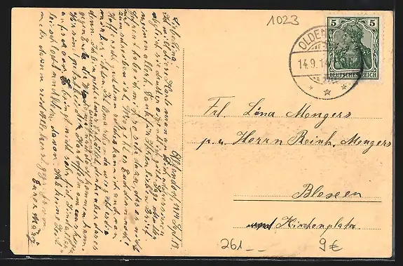 gelaufen 1914, Abriebspuren li. und oben mittig, minimaler Eckschaden re. unten, guter Zustand