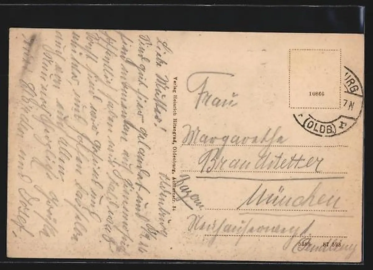 Personenbezogene Daten auf der Rückseite der Karte wurden durch blauen Textmarker unkenntlich gemacht. Die blauen Stellen sind auf die Vorderseite durchgeweicht und wirken sich negativ auf das Postkartenfoto aus