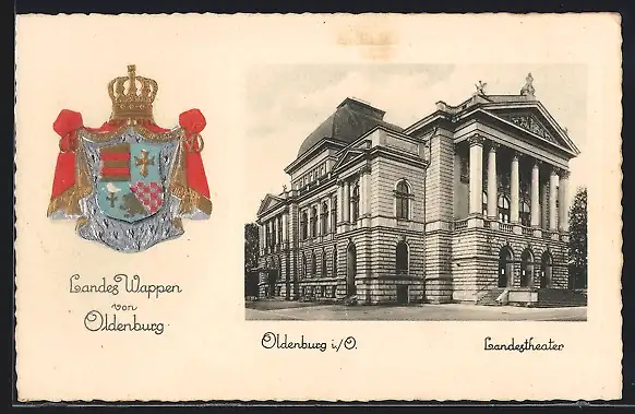 AK Oldenburg i. O., Partie am Landestheater, Passepartout mit geprägtem Landeswappen