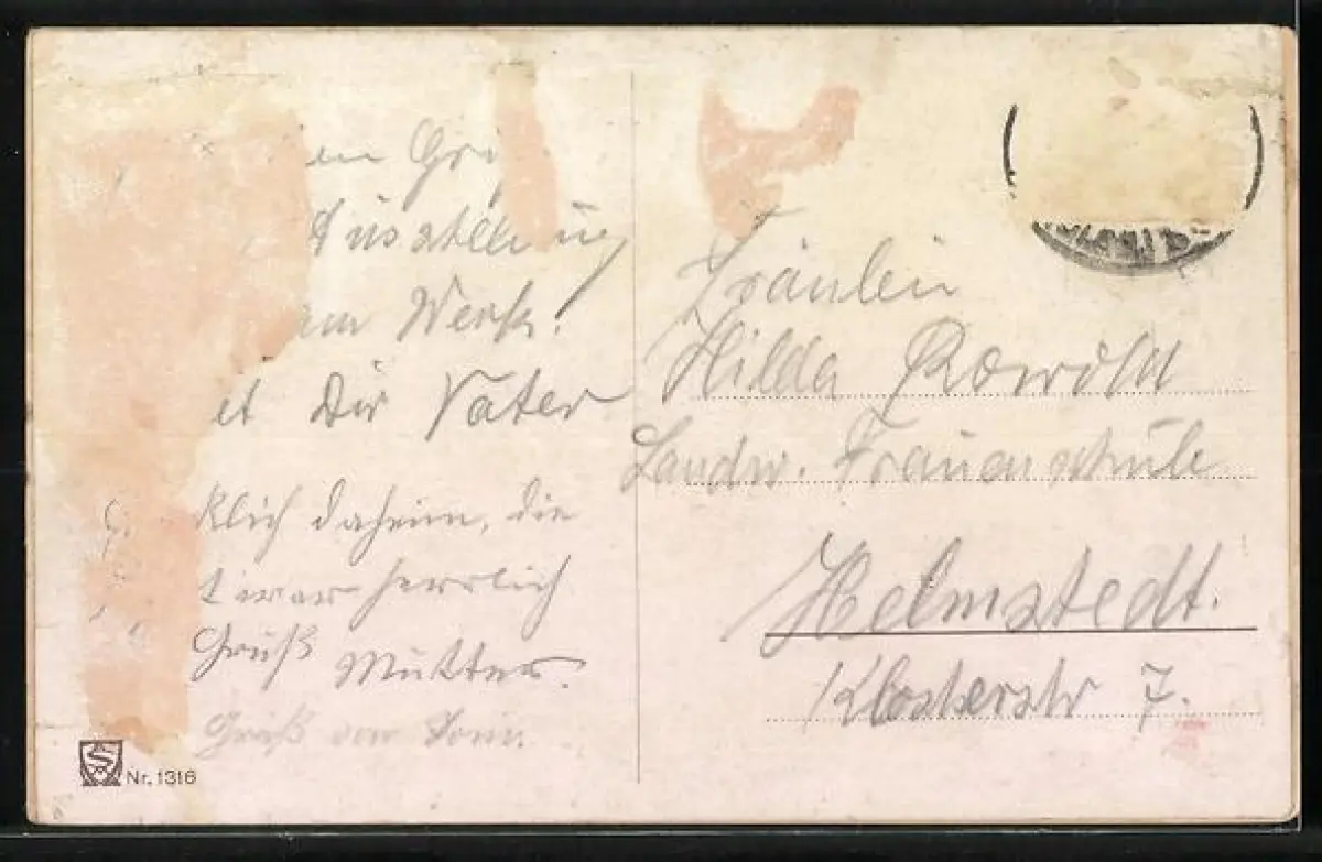 alte Ansichtskarte, gelaufen, Abriebspuren re. und li., Briefmarke entfernt, rückseitig Oberflächenschaden