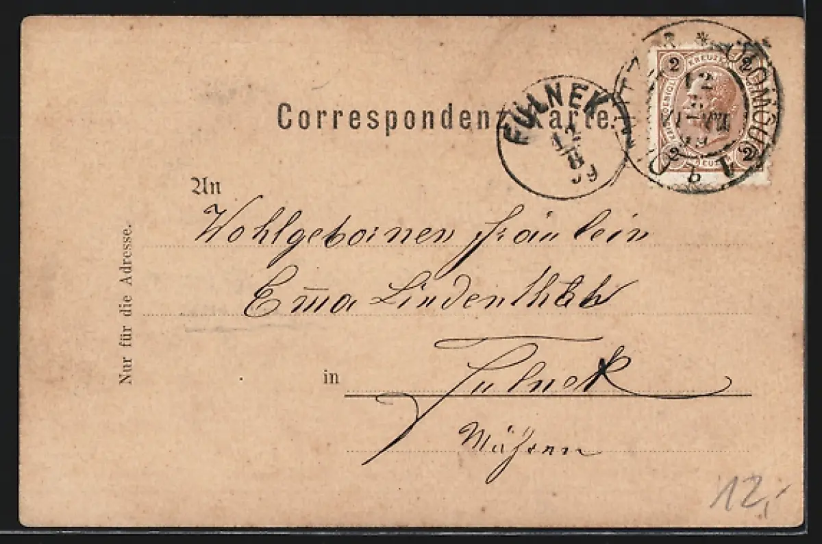 alte Ansichtskarte, gelaufen 1899, Eckknicke links oben und rechts unten, guter Zustand