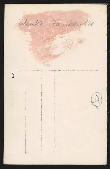 Personenbezogene Daten auf der Rückseite der Karte wurden durch blauen Textmarker unkenntlich gemacht. Die blauen Stellen sind auf die Vorderseite durchgeweicht und wirken sich negativ auf das Postkartenfoto aus