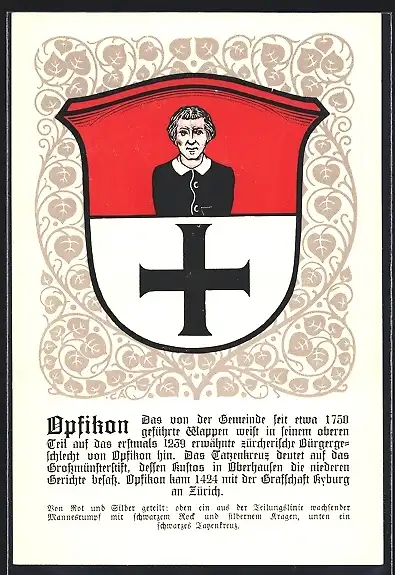 AK Opfikon, Wappen auf Blatt-Ornamenten, Info-Text