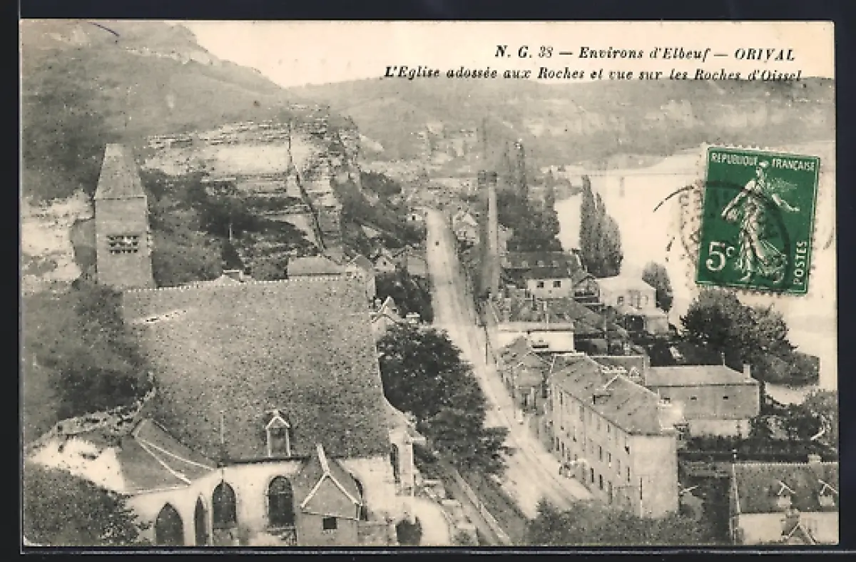 AK Orival, L`Église adossée aux Roches et vue sur les Roches d`Oisel