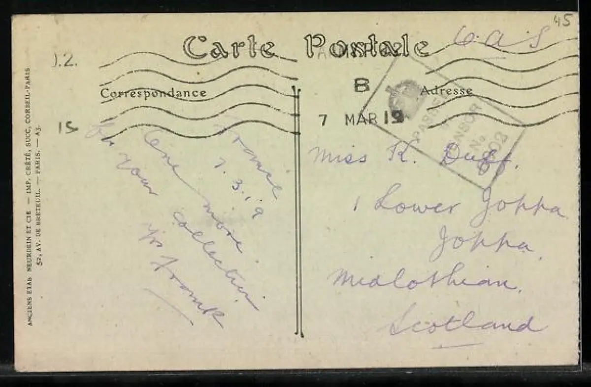 Personenbezogene Daten auf der Rückseite der Karte wurden durch blauen Textmarker unkenntlich gemacht. Die blauen Stellen sind auf die Vorderseite durchgeweicht und wirken sich negativ auf das Postkartenfoto aus