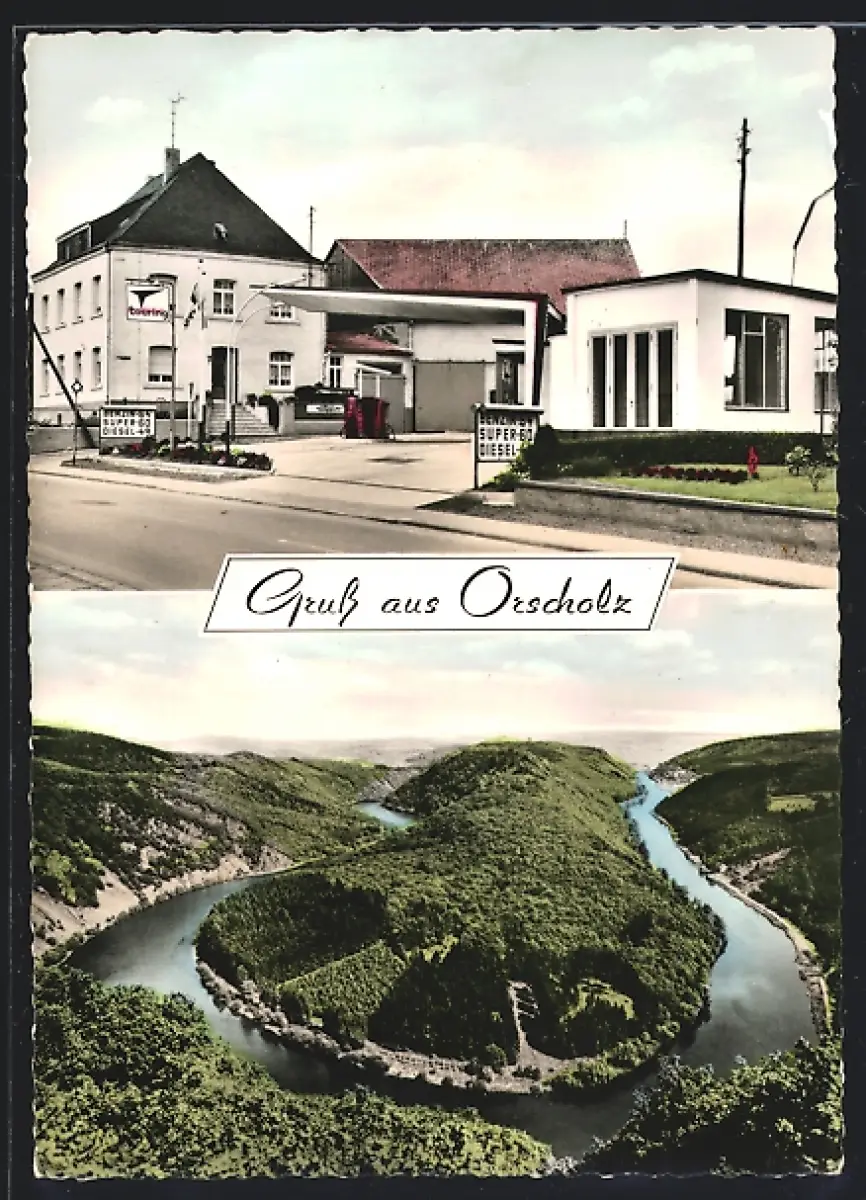 AK Orscholz, Strassenpartie mit Tankstelle Touring, Partie aus der Vogelschau