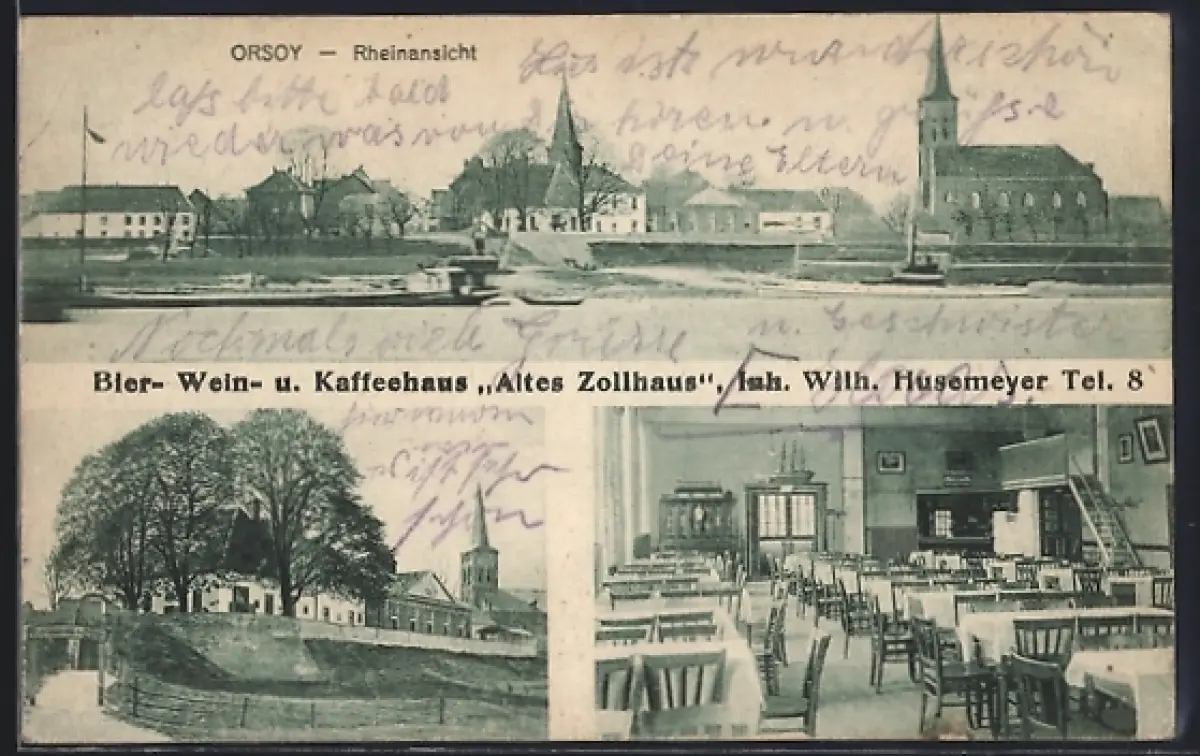 AK Orsoy, Bier-, Wein- u. Kaffeehaus Altes Zollhaus, Inh. Wilh. Husemeyer, Rheinansicht