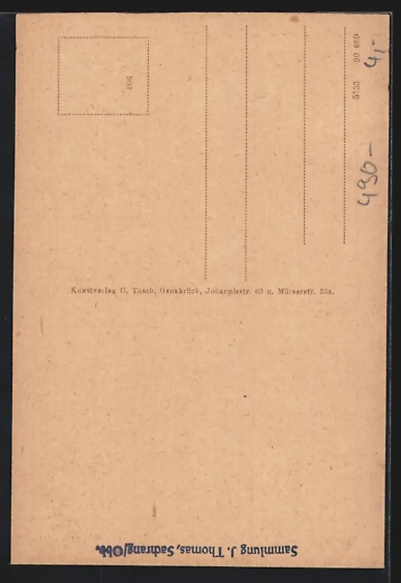 Personenbezogene Daten auf der Rückseite der Karte wurden durch blauen Textmarker unkenntlich gemacht. Die blauen Stellen sind auf die Vorderseite durchgeweicht und wirken sich negativ auf das Postkartenfoto aus