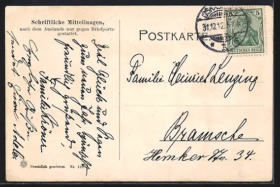 alte Ansichtskarte, gelaufen 1912, Eckknick re. unten, minimaler Einriss re. unten, guter Zustand