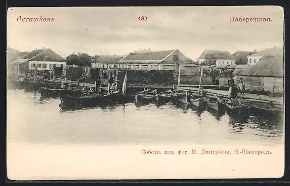 AK Ostaschkow, Uferpromenade mit Booten und Häusern