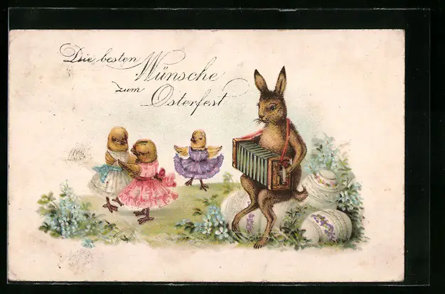 AK Osterhase mit Akkordeon, Tanzende Osterküken