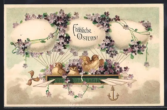 AK Osterküken im Zeppelin mit Vergissmeinnicht