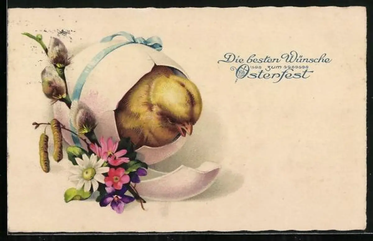 AK Osterküken in einer Eierschale mit Schleide, Weidenkätzchen