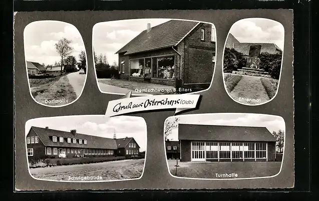 AK Osterscheps /Oldb., Gemischtwaren B. Eilers, Schulgebäude, Ehrenmal
