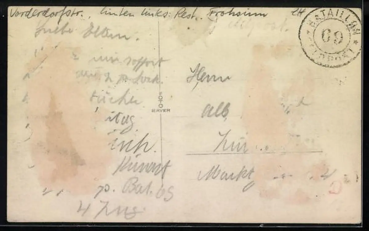 Personenbezogene Daten auf der Rückseite der Karte wurden durch blauen Textmarker unkenntlich gemacht. Die blauen Stellen sind auf die Vorderseite durchgeweicht und wirken sich negativ auf das Postkartenfoto aus
