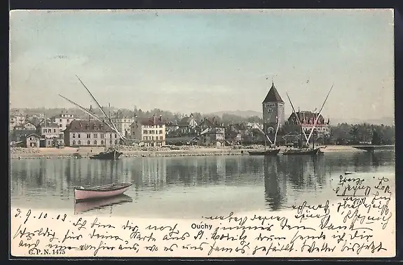 AK Ouchy, Ortspanorama vom Wasser aus, mit Segelbooten